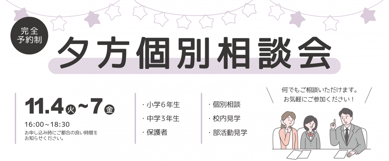 - 2025/09/30小学5・6年生と中学生対象:夕方個別相談会【11/4(火)~11/7(金)】