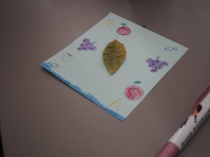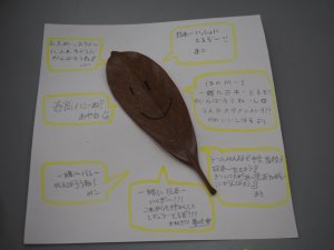 プログラムの一つ「落ち葉でしおり作り」では、地面に散らばる無数の葉の中からたった一枚を選び、3年後の自分へのことばを添えてしおりを作ります。