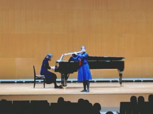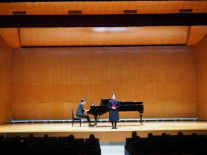 2曲歌い、きれいな歌声と静かな曲調が講堂内に響き渡り、会場はしんみりとした雰囲気に包まれ、涙を浮かべる方も見られました。
