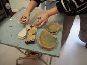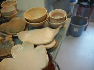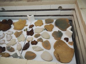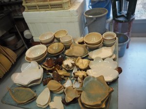 ろくろを使って成形したお茶碗や湯呑み、葉っぱを集めて模様をつけ、仕上げに釉薬をかけたお皿など、生徒一人ひとりの個性が感じられる作品がずらりと並び、圧巻の光景となりました。