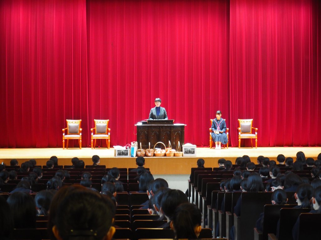 本校では、全生徒のご家庭に、お米、たまねぎ、にんじん、じゃがいものなどの献品をお願いし、献げられた品は「NPO法人 ホームレス支援 福岡おにぎりの会」にお届けしています。さらに今年も、手芸同好会がネックウォーマーを編んでくれました。
