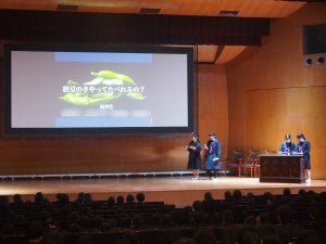 高2は総合的な探究の時間で、何を明らかにしたいのか・どんな課題を解決したいのか、自分でテーマを設定し、約1年間探究活動を行ってきました。午前中に予選審査を行い、64グループから8グループを選出しました。午後は講堂で決勝審査を行い、中3・高1も見学する中、グランプリ等を決定しました。