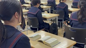 新入生にとって初めてとなる朝の礼拝が行われました。最初の数日間は、全校で教室礼拝を行い、礼拝の流れや聖書についての説明、聖書の開き方などを一つひとつ丁寧に学んでいきます。