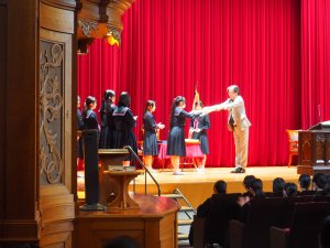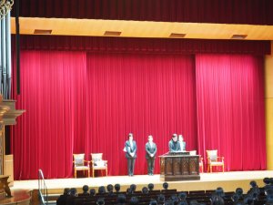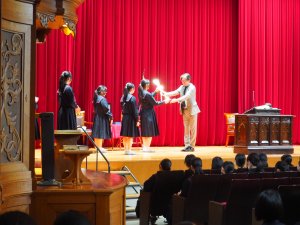 また、礼拝後には、今年度に顕著な成績を収めた生徒への表彰式が行われました。高校バレー部、バトンカラーガード部、音楽科、フィギュアスケート、ゴールボール、教会出席において努力を重ねた生徒たちが表彰されました。