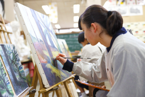 カリキュラムの特徴は、普通科でありながら美術の授業が3年間開設されているところです。さらに1年次は油絵とデザイン、2年次は油絵とデザインと陶芸といった、より専門性の高いクラスで学べる仕組みがあります。このような豊かな環境で学ぶことにより、毎年、アートやデザインのほかに、建築やファッション、映画や舞台芸術の世界へと進んでいく生徒を多く輩出しています。